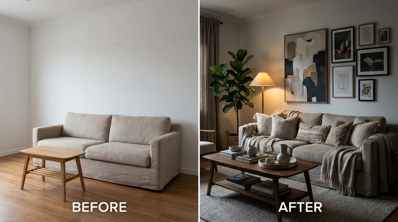 Split-screen before and after of same living room, left side shows bare room with plain sofa and empty walls, right
